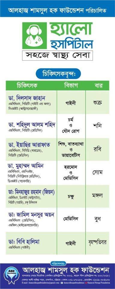 Hello Hospital, a specialized hospital of Alhaj Shamsul Hoque Foundation, has now brought outdoor services to its own office. Alhaj Shamsul Hoque Foundation took this great initiative when the people in Corona were being deprived of proper treatment. In Chandgaon of Chattogram area, this specialized hospital started its journey with medical services from 7th September, 2020. Anyone from any area can avail this service for free. Every day experienced doctors provide medical services for different diseases. Services are provided for various diseases including gynecology, pediatrics, rheumatism, diabetes, eye test, skin and sexually transmitted diseases, medicine. In addition, free diabetes, blood group, blood pressure diagnosis, including various diseases are tested. Medical services will be provided free of cost every day of the week from 3 pm to 9 pm. Besides, other services of Hello Hospital like telemedicine, ambulance service, oxygen service are running.